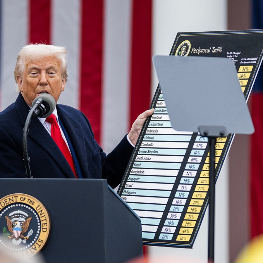 Trump showing a chart with reciprocal tariffs.jpg). Photo courtesy of The White House. Public domain.