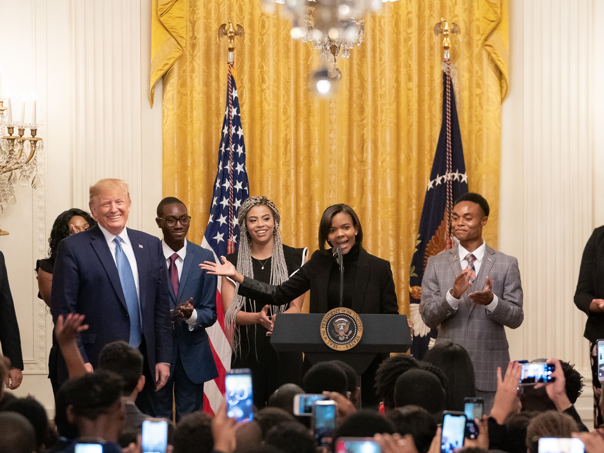 President Donald J. Trump listens as Candace Owens addresses her remarks at the Young Black Leadership Summit Friday, October 4, 2019, in the East Room of the White House. Official White House Photo by Tia Dufour. Public domain.