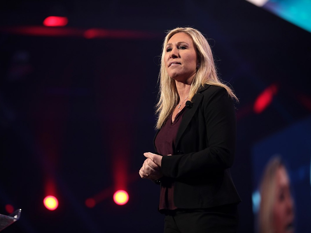 U.S. Congresswoman Marjorie Taylor Greene speaking with attendees at the 2021 in Phoenix Arizona.jpg). Photo by Gage Skidmore under CC BY-SA 2.0.