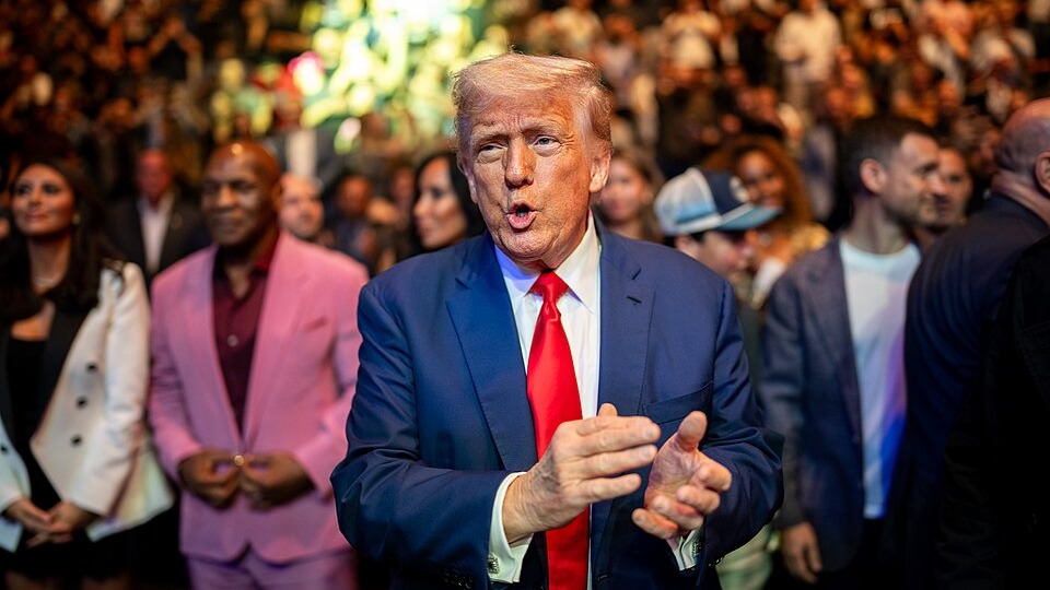 President Donald Trump attends UFC 316 at the Prudential Center in Newark, NJ., June 7, 2025.jpg). Official White House Photo by Daniel Torok. Public domain.
